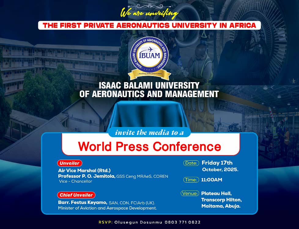 Today, we unveil the Isaac Balami University of Aeronautics and Management (IBUAM), Africa’s first privately owned university dedicated to aeronautics and management. This is not just a university; it is a revolution designed to shape the future of African aviation and leadership.